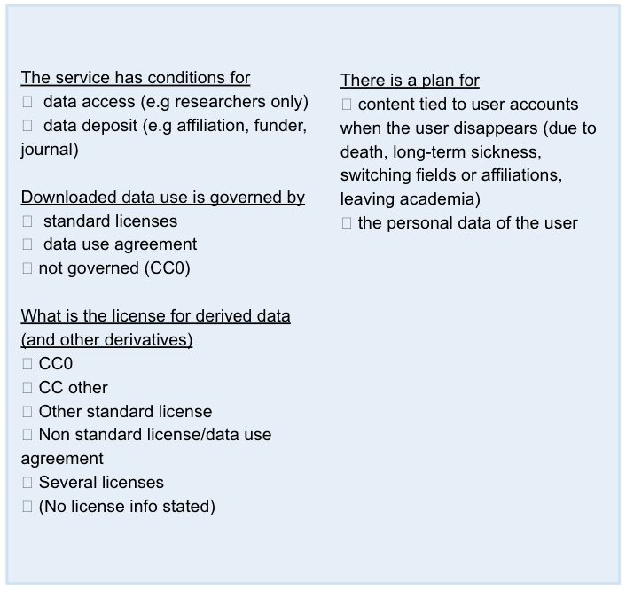 It is essential that a service uses appropriate licensing. Licensing conditions of uploading data to the platform, or reusing data within the platform, need to be clearly and transparently articulated.