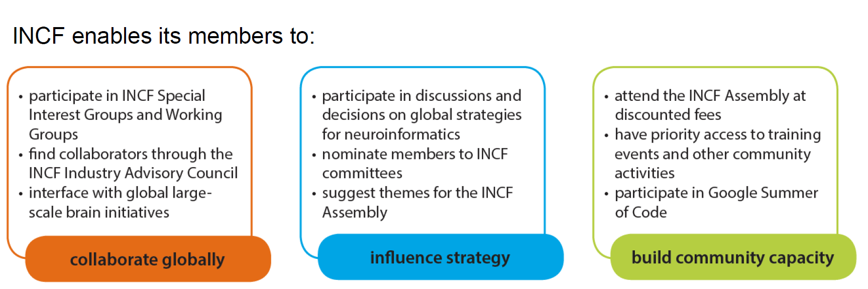 - Priority access to training events and other INCF activities
